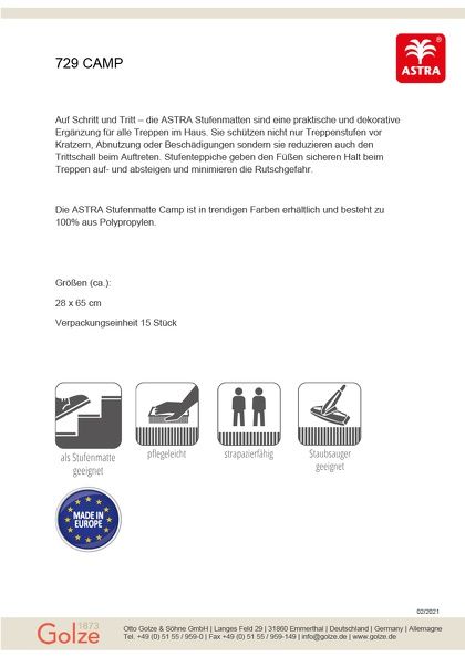 Die ASTRA Stufenmatte Camp ist in vier trendigen Farben erhältlich. Wohlfühlen bei jedem Schritt - ASTRA Stufenmatten sind eine sinnvolle Ergänzung für alle Treppen im Haus. Hier zählen Sicherheit und Optik. Stufenmatten verleihen jedem Zuhause eine ganz persönliche Note – und das macht Wohnen aus. Den Füßen beim Treppensteigen sicheren Halt zu geben, ist ein zusätzliches Wohlgefühl. Deshalb gibt es ASTRA Stufenmatten.