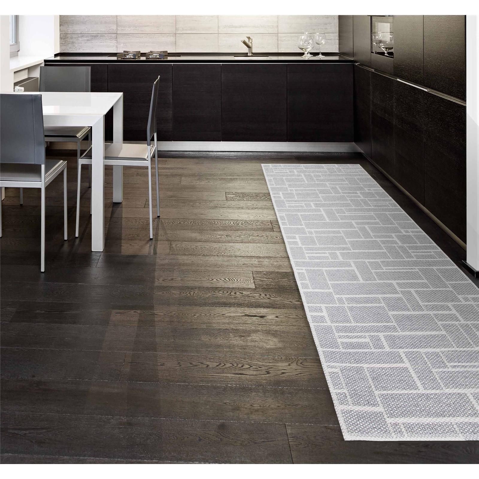 Die funktionalen, praktischen, langlebigen und vielseitigen Swedy-Teppiche werden mit handwerklicher Sorgfalt unter Verwendung von Jacquard-Rahmen nach traditionellen schwedischen Textilverfahren hergestellt. Sie werden aus PVC hergestellt und entsprechen vollständig der REACH-Norm, die die Produktion und den Vertrieb regelt. Sie werden dann Stück für Stück mit einer Hochfrequenztechnologie veredelt. Sie sind perfekt waschbar, behalten alle ihre Eigenschaften, einschließlich der Farben und Muster, bei und eignen sich sowohl für den Innen- als auch für den Außenbereich. Sie haben eine Garantie von drei Jahren. Geschmack, Kreativität und Design verschmelzen in den Kollektionen von Swedy zu einer Reihe von modernen Teppichen, die sich ideal für die verschiedenen Anforderungen an Gebrauch und Stil eignen. Geometrische oder florale Muster, Symmetrien oder Überschneidungen, scharfe oder zarte Pinselstriche sind die Themen, die die Teppiche dank zahlreicher Lösungen unverzichtbar, dekorativ und durch die Verbesserung ihrer Funktionalität voll als Einrichtungsaccessoires geeignet machen. Die geometrisch definierte Zeichnung mit klareren Linien auf dunklerem Hintergrund macht den Teppich besonders elegant und passt zu verschiedenen Bodenbelägen, sowohl modern als auch rustikal. Eine perfekte Lösung, die sowohl in die Küche als auch ins Bad passt.